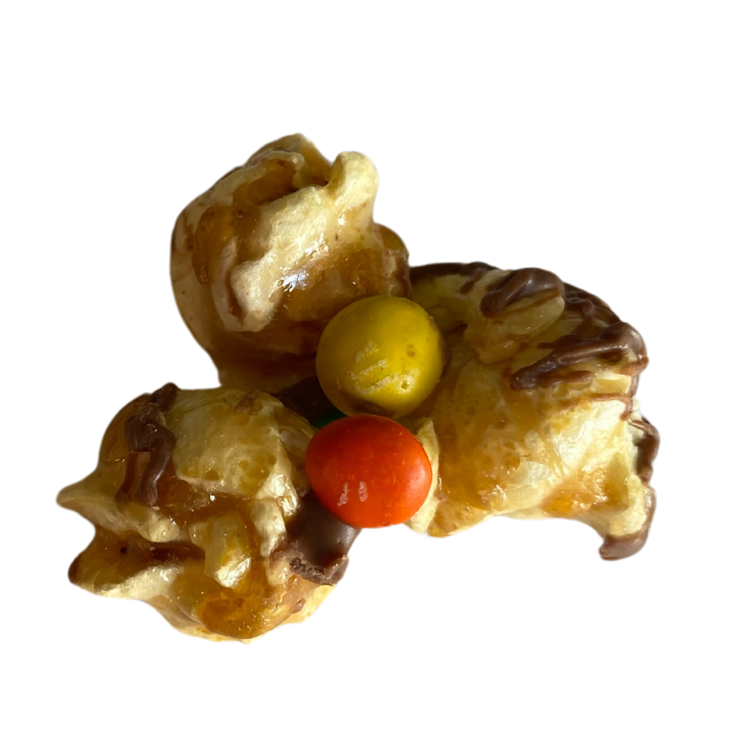 Sweet popcorn with a milk chocolate drizzle and mini M&Ms dropped on top!